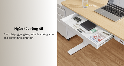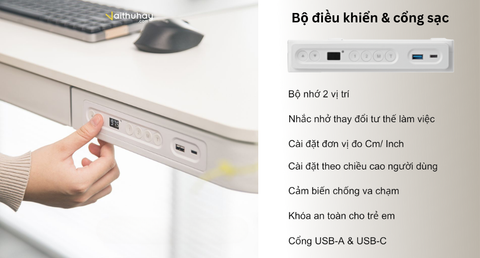 Bàn được tích hợp bảng điều khiển ngay cạnh mép, giúp bạn dễ dàng nâng – hạ độ cao chỉ bằng một chạm. Thao tác đơn giản, tốc độ nhanh, không mất thời gian căn chỉnh bằng tay.