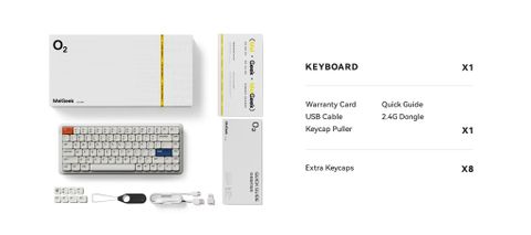 Hộp sản phẩm MelGeek O2 bao gồm bàn phím, cáp USB, keycap puller, dongle 2.4G, thẻ bảo hành, sách hướng dẫn và 8 keycap thay thế. Đầy đủ tiện ích cho người dùng từ lúc khui hộp.