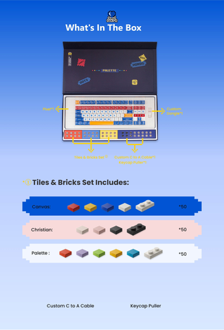 Bộ sản phẩm bao gồm bàn phím Pixel, Custom Dongle, cáp Custom C to A, Keycap Puller, cùng với Tiles & Bricks Set đa dạng màu sắc (Canvas, Christian, Palette – mỗi set gồm 50 viên). Tất cả được thiết kế để mang lại trải nghiệm tùy biến tối đa và sự tiện lợi ngay khi mở hộp.