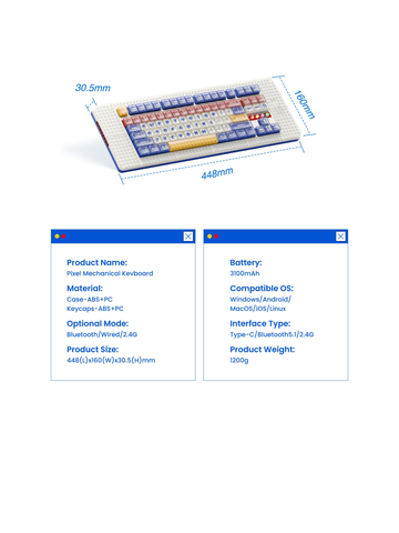 Bàn phím Pixel Mechanical Keyboard được chế tác từ vỏ ABS+PC bền bỉ và keycaps ABS+PC chất lượng cao, hỗ trợ 3 chế độ kết nối linh hoạt: Bluetooth, có dây và 2.4G. Với kích thước 448 x 160 x 30.5mm, trọng lượng 1200g, cùng pin dung lượng 3100mAh, bàn phím đảm bảo thời gian sử dụng lâu dài và tương thích đa nền tảng (Windows, Android, MacOS, iOS, Linux).