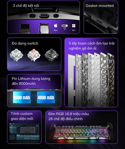 Thiết kế bắt mắt lấy cảm hứng từ Alien Aesthetics Gasket-mounted FR4 tạo trải nghiệm gõ êm ái và cân bằng ấn tượng Keycap PBT & PC cùng khung viền hợp kim nhôm cao cấp Trang bị Hot-swapping với Kailh/BSUN Linear switches Tích hợp hệ thống led 16,7 triệu màu cùng 13 chế độ sáng tùy chỉnh 5 lớp Plate Foam tăng cường trải nghiệm gõ Thời lượng pin lên đến 8000 mAh duy trì thời gian hoạt động lên đến 470 giờ Bảo hành chính hãng 1 năm