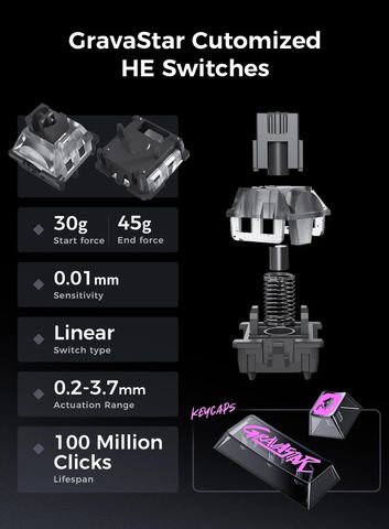 Switch Hall‑Effect tùy chỉnh “Blackcore”: Độ chính xác 0.01 mm và hành trình kích hoạt có thể điều chỉnh từ 0.1–4.0 mm theo bước 0.1 mm Latency thấp 0.25ms: Hệ thống 8000 Hz polling rate và scan key-position giúp phản hồi nhanh, phù hợp từ chơi game cơ bản đến làm việc hằng ngày Rapid Trigger + LKP + Snap‑Click: Tính năng nhằm tối ưu thao tác liên tục và giải quyết xung đột phím, giúp trải nghiệm mượt mà hơn Khung nhựa trong suốt, nhẹ nhàng, hiện đại: Thiết kế full-plastic frame với phần housing nhôm, mang lại độ bền tốt mà vẫn giữ trọng lượng nhẹ, cực kỳ thích hợp để mang đi hoặc setup desk tối giản 5 lớp foam giảm rung & âm thanh: Cấu trúc gasket-mounted với foam đa tầng cho cảm giác gõ êm và âm thanh tinh tế, nâng cao trải nghiệm dù ở không gian cần sự yên tĩnh - Hot‑swappable magnetic switches: Cho phép thay đổi switch dễ dàng mà không cần hàn, người dùng có thể trải nghiệm nhiều kiểu switch hoặc thay nhanh nếu hỏng hóc