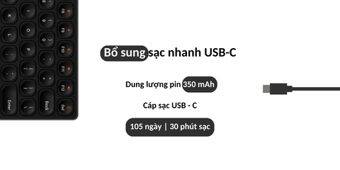 Bàn phím được trang bị sạc nhanh USB-C, giúp bạn sạc đầy pin chỉ trong 30 phút. Dung lượng pin 350 mAh cho phép bạn sử dụng lên đến 150 ngày chỉ với một lần sạc.