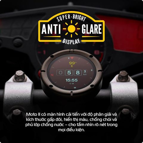Tận hưởng tầm nhìn sáng rõ hơn với màn hình cải tiến của Moto II - gấp đôi độ phân giải và kích thước, hiển thị màu sắc sống động. Độ bền vượt trội, chống nước, chống sốc - Moto II sẵn sàng cho mọi cuộc phiêu lưu, được thiết kế để đối mặt với mọi điều kiện khắc nghiệt và bất ngờ trên đường.