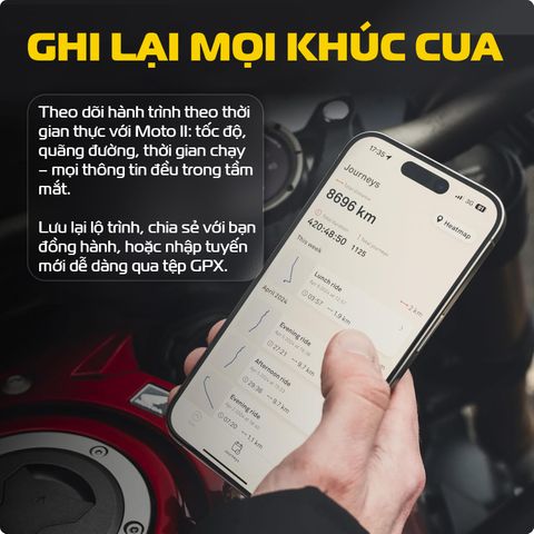 Trong suốt chuyến đi, thiết bị Moto II liên tục cập nhật các thông số quan trọng như tốc độ, quãng đường và thời gian, đồng thời hiển thị trực tiếp trên màn hình để bạn theo dõi một cách dễ dàng và chính xác.