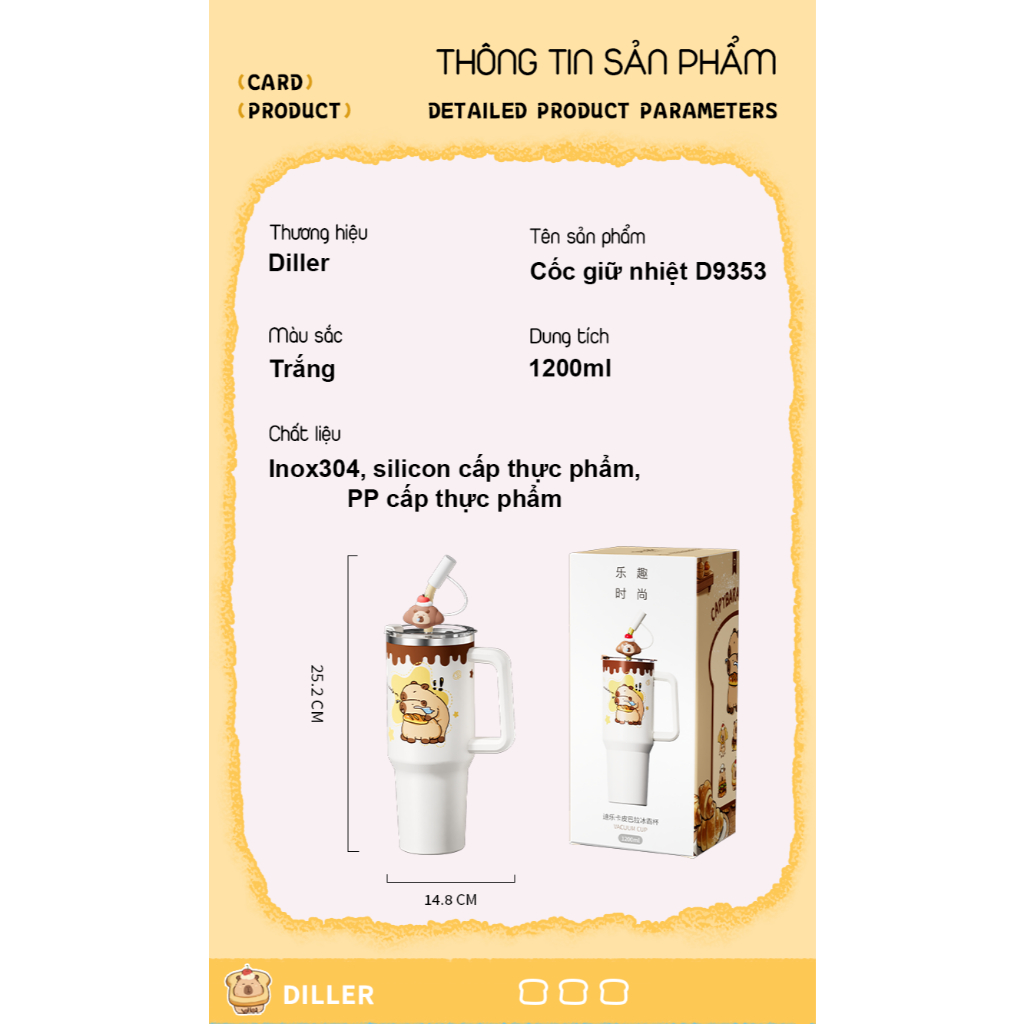 Bình Giữ Nhiệt Diller D9353 Capybara Series 1200ml, Kèm Ống Hút Inox Và Nắp Đậy
