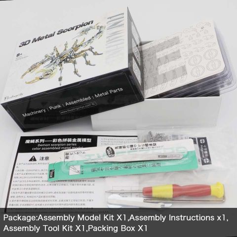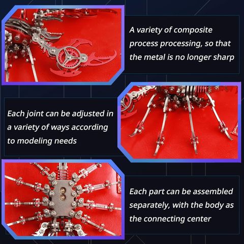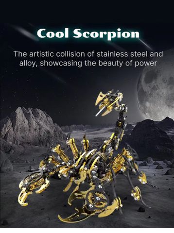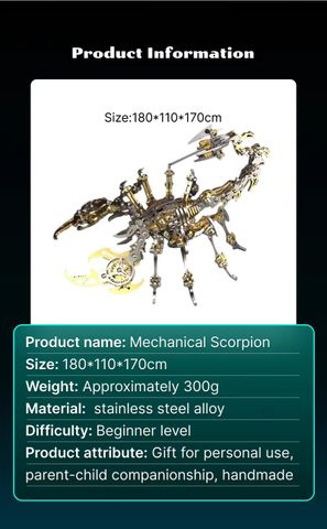 Sau khi lắp ráp, kích thước của mô hình kim loại là 180x110x170 cm, làm cho nó trở thành một món đồ trang trí bàn tuyệt vời cho văn phòng, phòng khách, phòng ngủ, quán cà phê và hơn thế nữa. Chân và kìm của mô hình bọ cạp có nhiều khớp di động, cho phép điều chỉnh linh hoạt để tạo ra các tư thế khác nhau