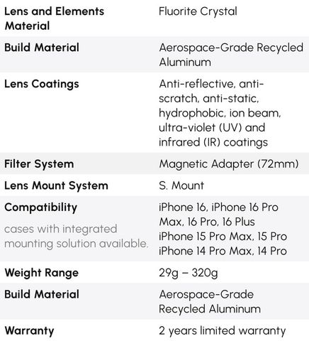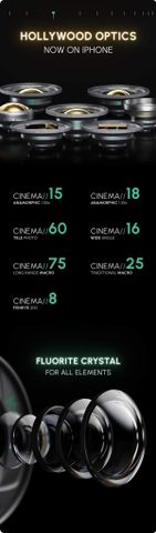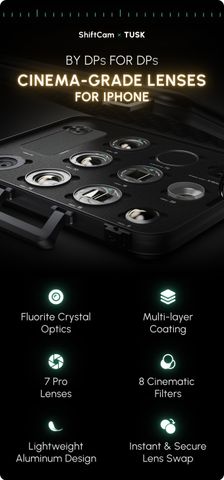 Được tạo nên bởi các nhà làm phim từng đoạt giải của TUSK và kỹ sư quang học của ShiftCam, Cinema Series sử dụng tinh thể fluorite và kính phủ đa lớp 98 tầng, mang đến độ sắc nét điện ảnh, hiệu ứng anamorphic chân thực mà không méo mó. Hệ thống nhôm hàng không vũ trụ này biến iPhone thành thiết bị quay phim chuyên nghiệp, tối ưu cho mọi quy trình sáng tạo.