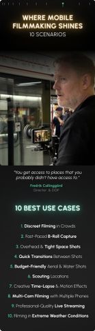 Cinema Series tối ưu cho 10 tình huống: từ quay lén trong đám đông, chụp B-roll nhanh, góc hẹp hoặc trên cao, đến chuyển cảnh mượt mà, quay tiết kiệm trên không và dưới nước, dò địa điểm, hiệu ứng time-lapse sáng tạo, đa máy quay, livestream chuyên nghiệp, và ghi hình trong thời tiết khắc nghiệt.