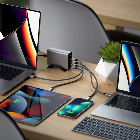 Nâng cấp và tối ưu hóa việc sạc pin trên bàn làm việc của bạn lên một tầm cao mới với Bộ Sạc USB-C 165W 4 Cổng PD GaN của Satechi. Dock này tích hợp công nghệ Gallium Nitride (GaN) để cung cấp nguồn cho đến bốn thiết bị cùng một lúc.