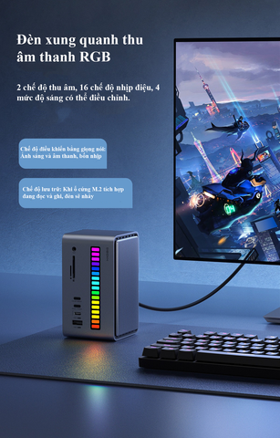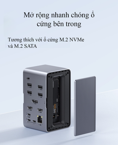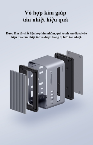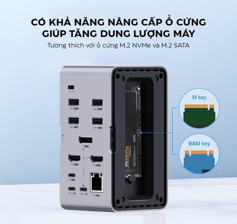 - Tích hợp vỏ ổ cứng M.2: Hỗ trợ cả chuẩn NVMe và SATA, kèm đèn LED báo hoạt động đọc/ghi dữ liệu tiện lợi