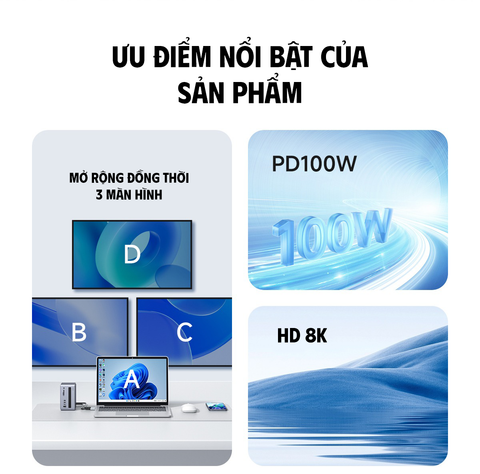 - Sạc nhanh PD 100W: Hỗ trợ sạc nhanh mạnh mẽ qua cổng USB-C, đảm bảo thiết bị luôn sẵn sàng sử dụng