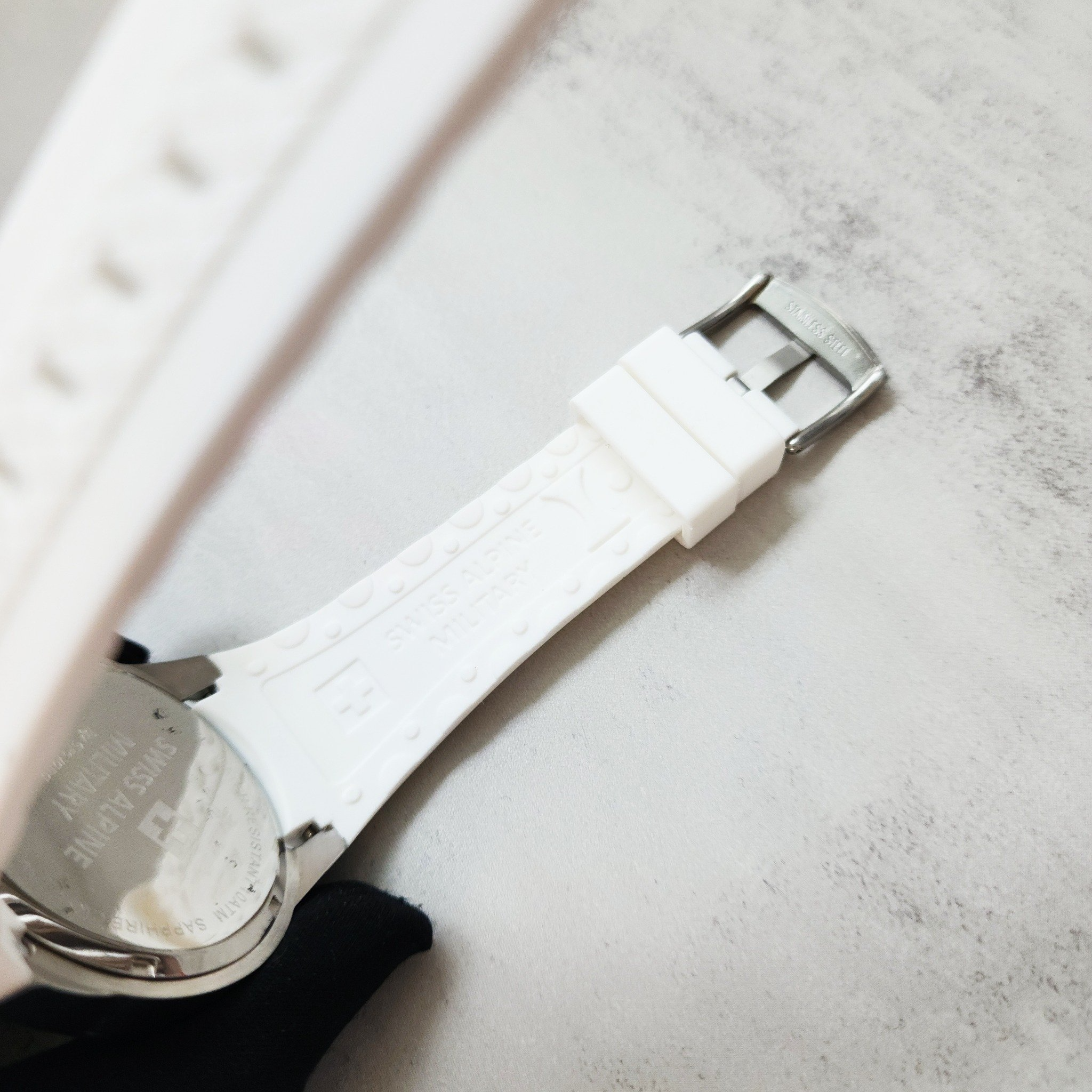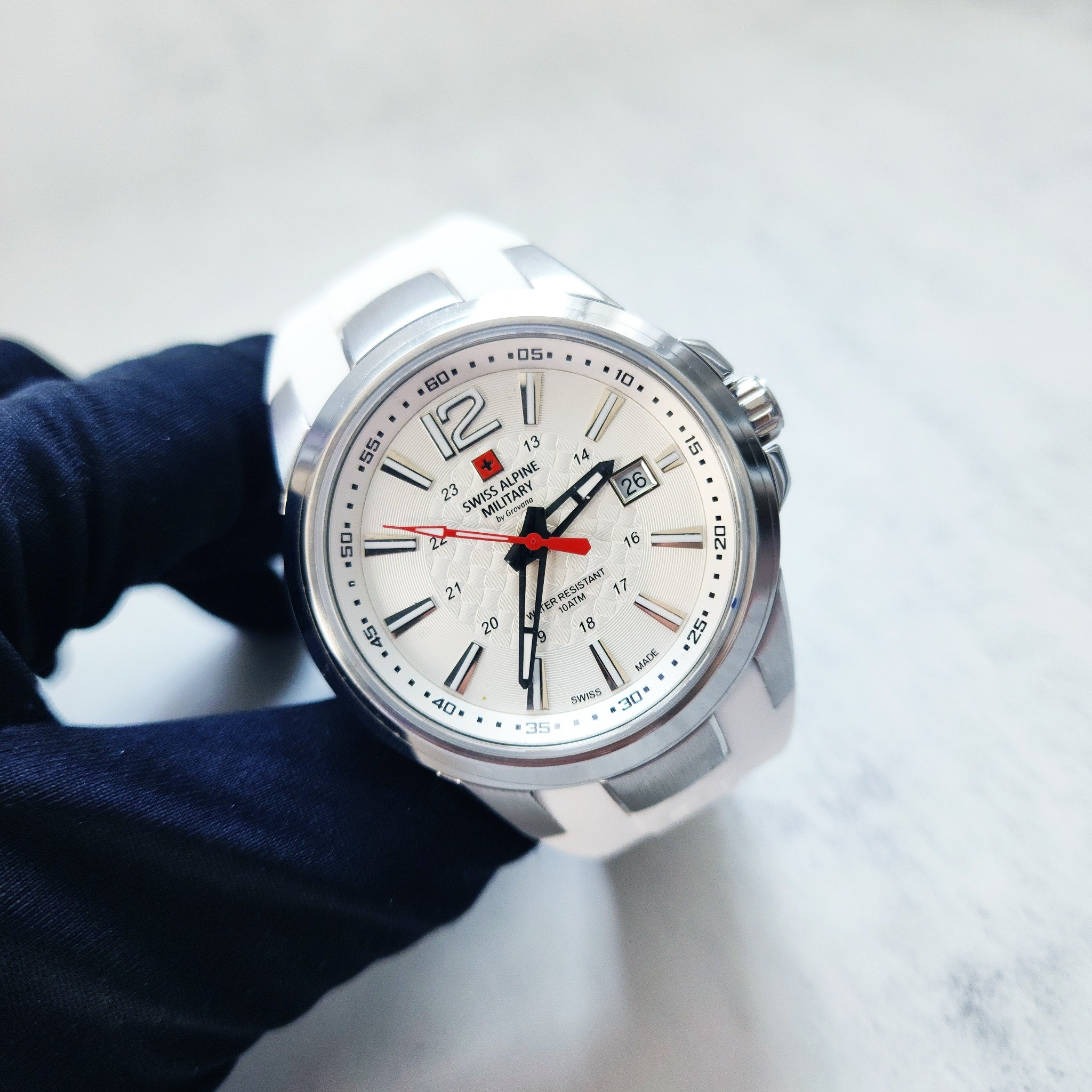 Swiss Alpine Military 7058.1833 sở hữu vẻ ngoài hầm hố và nam tính với đường kính mặt 45mm, tạo điểm nhấn mạnh mẽ trên cổ tay. Vỏ được làm từ thép không gỉ cao cấp, mang lại độ bền bỉ và khả năng chống chịu va đập tốt. Dây đeo silicone (cao su) không chỉ tạo cảm giác êm ái, thoải mái khi đeo mà còn chống thấm nước hiệu quả, lý tưởng cho mọi hoạt động thể thao hay ngoài trời.