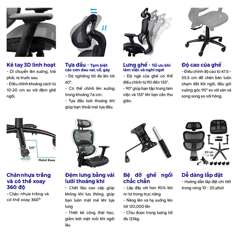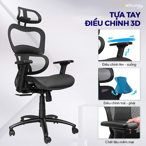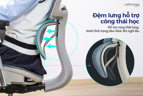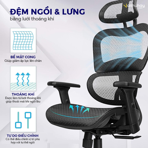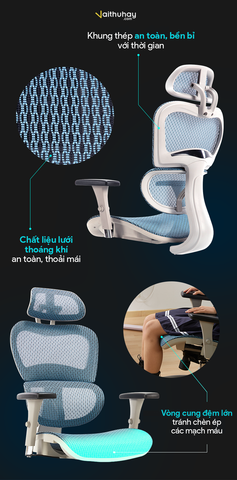 Sản phẩm Ghế công thái học Ergonomic Chairs phân phối bởi Vaithuhay với đầy đủ các tính năng chuẩn công thái học mang đến sự thoải mái, tiện nghi và bảo vệ sức khỏe tránh các bệnh văn phòng thường gặp như thoát vị đĩa đệm, đau mỏi lưng - vai - gáy hay tê bì, đau nhức chân tay.