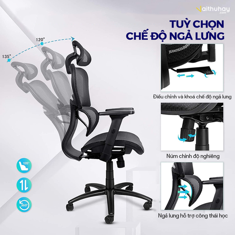 Hơn thế nữa, tựa lưng của ghế cho điều chỉnh độ nghiêng thích hợp, bạn có thể điều chỉnh thẳng đứng 90 độ hay ngả lưng thoải mái nhất với độ nghiêng tối đa 135 độ, sau đó khóa lại vị trí tốt nhất. Công nghệ điều chỉnh thân ghế này đã được cấp bằng sáng chế, có thể đem đến tư thế thoải mái nhất với từng người, từng vóc dáng khác nhau.