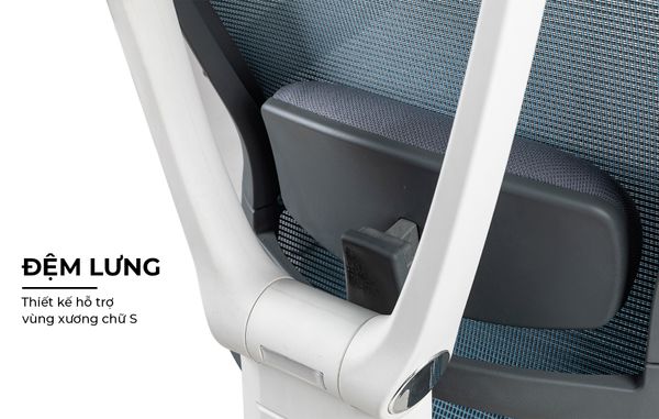 Tích hợp đệm lưng công thái học - Sau lưng ghế đuợc tích hợp sẵn đệm lưng, ôm sát vào vùng xương chữ S - vị trí dễ bị tổn thương nhất khi chúng ta ngồi làm việc không đúng tư thế trong một khoảng thời gian dài.