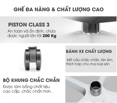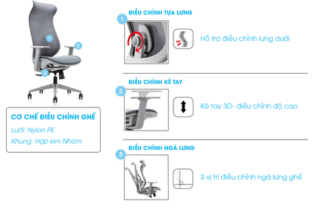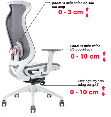 Ghế có chốt nâng hạ dễ dàng giúp bạn có thể tự điều chỉnh độ ngã lưng tuỳ theo nhu cầu của bản thân. Ghế còn được trang bị tấm đệm ở sau lưng và bên dưới, mang lại sự êm ái cho các cơ khi làm việc. Điều này cũng phân tác lực tác động lên chân, tránh tình trạng tê mỏi chân khi làm việc quá lâu. Từ đó, mang lại sự thoải mái trong quá trình làm việc. Đồng thời bạn cũng có thể điều chỉnh độ cao của ghế/ phần nệm dựa lưng/ tay ghế.
