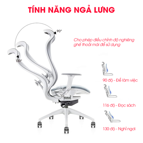 Hơn thế nữa, tựa lưng của ghế cho điều chỉnh độ nghiêng thích hợp, bạn có thể điều chỉnh thẳng đứng 90 độ hay ngả lưng thoải mái nhất với độ nghiêng tối đa 130 độ, sau đó khóa lại vị trí tốt nhất. Công nghệ điều chỉnh thân ghế này đã được cấp bằng sáng chế, có thể đem đến tư thế thoải mái nhất với từng người, từng vóc dáng khác nhau.