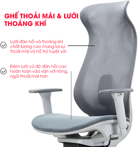 Chất liệu lưới của thân ghế và đệm ngồi đảm bảo độ bền cao, lưới có độ căng lớn và không bị biến dạng khi sử dụng, khoảng cách giữa các lỗ khí được phân bổ hợp lý giúp Lưng thoáng mát không bị hầm hay tạo cảm giác ngột ngạt. Đệm ngồi bằng mút khuôn mật độ cao lên đến 55kg / m³.