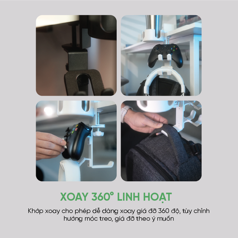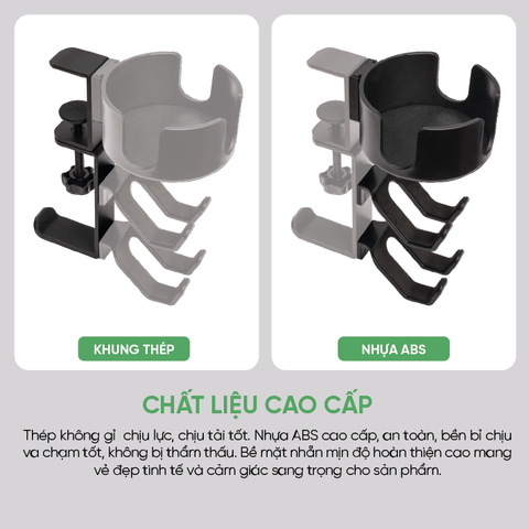 Thiết kế 4-trong-1 tiện lợiTiết kiệm không gian và giúp tổ chức mọi vật dụng cần thiết trong tầm tay. Xoay 360° linh hoạtTùy chỉnh vị trí các móc treo và khay giữ ly dễ dàng theo nhu cầu sử dụng. Khay giữ ly thông minhThiết kế khoét vừa vặn với các ly/tách có quai, giúp giữ ly ổn định, chống đổ. Đệm cao su chống trượtTăng ma sát, bảo vệ bàn và thiết bị của bạn khỏi trầy xước. Chất liệu cao cấpThân hợp kim nhôm bền bỉ, không gỉ sét, chịu lực tốt; khay giữ ly làm từ nhựa ABS chắc chắn, chịu va đập. Khả năng chịu tải lớnGiá đỡ có thể chịu được tải trọng lên đến 9kg, treo được nhiều vật dụng nặng như balo, tai nghe, tay cầm, mũ bảo hiểm.
