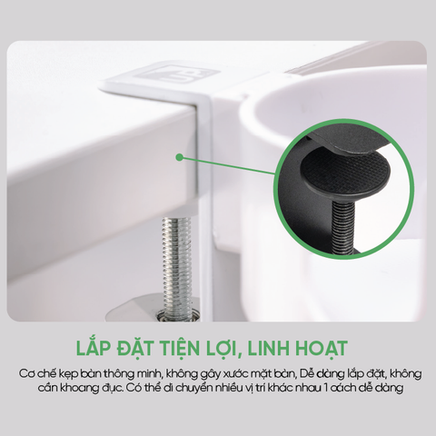 Tích hợp giá đỡ điện thoại, khay giữ ly, móc treo và kẹp bàn trong một thiết bị nhỏ gọn. Giúp tối ưu không gian làm việc và giữ mọi vật dụng cần thiết trong tầm tay. Phù hợp cho cả bàn làm việc tại nhà lẫn không gian văn phòng hiện đại.