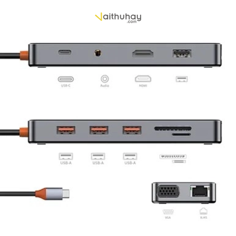 | Tính năng | x1 Type - C PD x2 USB - A 3.0 x2 USB - A 2.0 x1 SD/TF x2 HDMI x1 RJ45 x1 VGA x1 Jack 3.5mm Audio |