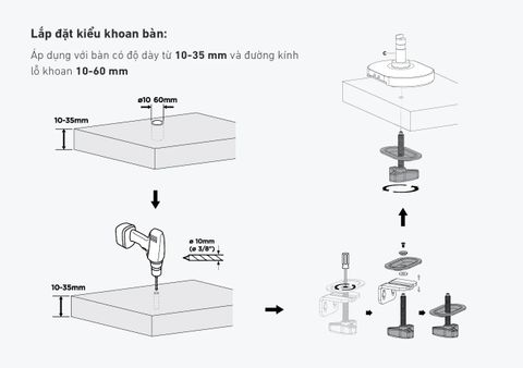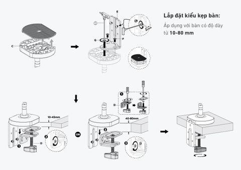Kẹp bàn: Cho bàn có độ dày từ 10~85mm.