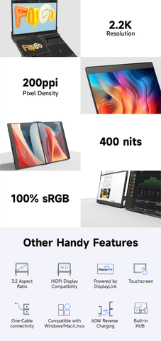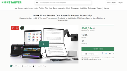 Được thiết kế cho những người thường xuyên đi công tác, người làm việc từ xa và người làm công việc sáng tạo, Màn hình di động kép JSAUX FlipGo có tính di động (nặng từ 1,1kg đến 1,6kg), tiện lợi (chỉ cần một cáp USB-C để cấp nguồn) và hiệu quả. Có ba mẫu màn hình di động hai màn hình: phiên bản Standard, Pro và Touch Screen. Phiên bản Màn hình cảm ứng có tính năng hỗ trợ cảm ứng và cử chỉ cho macOS và Windows trên màn hình kép. Người dùng có thể sử dụng FlipGo của mình làm màn hình cảm ứng thông thường và bàn di chuột thứ hai cho máy tính xách tay của họ.