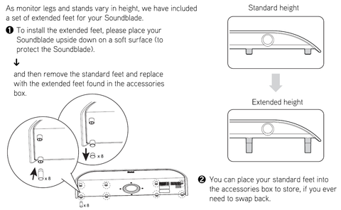 Bởi vì đế và chân màn hình có độ cao đa dạng, trong bộ sản phẩm loa Soundblade có trang bị thiết bi chân đế mở rộng.