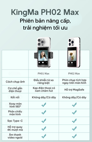 Nếu PH01 Max đã giúp bạn quay chụp dễ dàng hơn, thì PH02 Max còn mang đến trải nghiệm tiện lợi và chuyên nghiệp hơn nhờ những nâng cấp đáng giá: