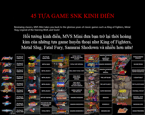 - Tích hợp sẵn 20 tựa game kinh điển: Sản phẩm đi kèm với 20 tựa game huyền thoại như The King of Fighters, Metal Slug, và Samurai Shodown, mang lại trải nghiệm chơi game retro đầy hoài niệm