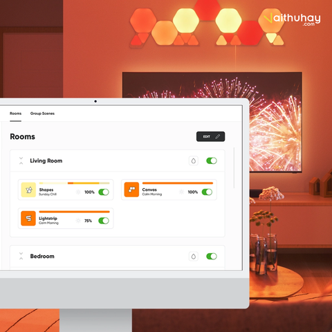 Với ứng dụng dành cho máy tính, bạn có thể điều khiển đèn Lines, Shapes, Essentials, Elements, Canvas hoặc Light Panels từ máy tính (Windows hoặc Mac). Tạo và tải xuống Nền mới, đặt Lịch hẹn cũng như sử dụng các tính năng yêu thích khác ngay trên máy tính của bạn. Ứng dụng máy tính được thiết kế nhằm đơn giản hóa công tác quản lý nhiều hệ thống lắp đặt lớn hơn, đồng thời cung cấp tính năng điều khiển nhiều bố cục thiết kế khác nhau cùng một lúc.