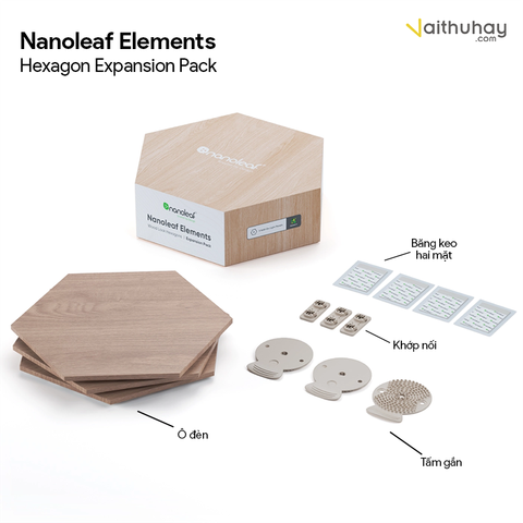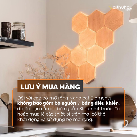 Nâng cấp thiết kế của bạn bằng cách bổ sung các ô đèn với Bộ mở rộng Nanoleaf Elements hình lục giác vân gỗ. Tương thích với tất cả các sản phẩm Connect+ (các mẫu NL42/NL47/NL48/NL52).