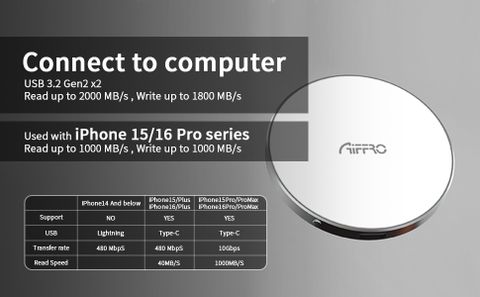 USB 3.2 Gen2x2 cho tốc độ đọc lên đến 2000MB/s, ghi lên đến 1800MB/s. Khi sử dụng với iPhone 15/16 Pro, tốc độ đọc/ghi đạt đến 1000MB/s.