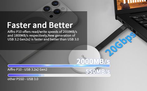 Aiffro P10 có tốc độ đọc/ghi lần lượt 2000MB/s và 1800MB/s. Thế hệ USB 3.2 Gen2x2 mới nhanh hơn và vượt trội hơn so với USB 3.0.