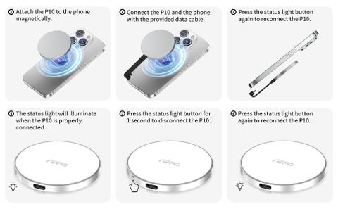 Gắn P10 vào điện thoại bằng nam châm MagSafe và kết nối qua cáp dữ liệu đi kèm. Đèn trạng thái sáng khi kết nối thành công. Nhấn nút đèn trạng thái 1 giây để ngắt kết nối, nhấn lại để kết nối lại.