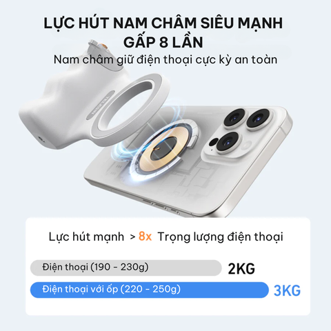Tay cầm sử dụng lực hút từ tính mạnh gấp 8 lần trọng lượng trung bình của điện thoại, mang lại độ an toàn vượt trội: