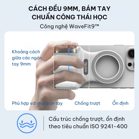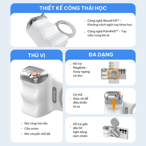 Bảo hành chính hãng 6 Tháng. Đổi trả 1-1 trong vòng 7 ngày. Lực từ tính 8x mạnh mẽ: Giữ điện thoại chắc chắn với lực hút 2-3KG, an toàn ở mọi góc độ. Công nghệ WaveFit9™ & PalmR45™: Cảm giác cầm nắm tự nhiên, chống trơn trượt và giảm mỏi tay. Màn trập ba giai đoạn: Nhấn nửa để lấy nét, nhấn đầy để chụp, nhấn đúp chuyển máy ảnh. Điều khiển bằng một tay: chụp 2 nấc, zoom nhanh, đổi chế độ, chuyển cam, mở cam tức thì. Điều khiển từ xa khoảng cách đến 10m với remote tháo rời tiện lợi. Đèn lấp đầy hai mặt từ tính: 3 chế độ màu, hoàn hảo cho selfie và chụp tĩnh vật. Thời lượng pin 10 tháng: Pin CR1632 130mAh tiết kiệm năng lượng, sử dụng lâu dài. Chụp 360° linh hoạt: Điều khiển từ xa, xoay ngang/dọc dễ dàng. Tương thích MagSafe & thiết kế nhỏ gọn: Gắn dễ dàng, mang theo mọi lúc với trọng lượng chỉ 109g.
