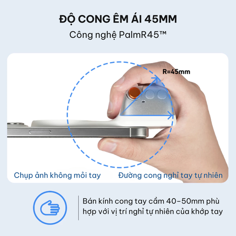 PalmR45™ Tech: Với độ cong lý tưởng 45mm ôm sát lòng bàn tay, tay cầm giảm thiểu cảm giác mỏi khi sử dụng trong thời gian dài. Đây là yếu tố giúp người dùng duy trì sự ổn định và thoải mái khi ghi hình liên tục.