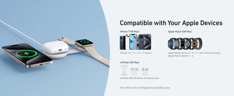 - Tương thích hoàn hảo với hệ Apple: Hỗ trợ sạc nhanh cho iPhone 15-12, Apple Watch Series 9-1, và AirPods với vỏ MagSafe.