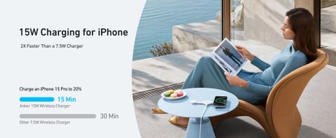 Tăng tốc sạc cho iPhone với công suất 15W từ Anker MagGo! Nhanh gấp đôi so với bộ sạc 7.5W thông thường, chỉ mất 15 phút để sạc iPhone 15 Pro lên 20%, trong khi các bộ sạc không dây 7.5W khác cần tới 30 phút. Trải nghiệm hiệu suất vượt trội và tiết kiệm thời gian với Anker 15W Wireless Charger.