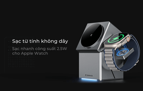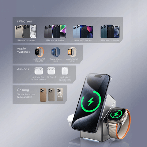 Với thiết kế 3 trong 1 thông minh, bạn có thể sạc cùng lúc iPhone, Apple Watch và AirPods một cách dễ dàng. Không còn phải loay hoay tìm kiếm dây sạc, không gian làm việc của bạn sẽ trở nên gọn gàng và hiện đại hơn bao giờ hết. Chỉ cần đặt thiết bị lên đế sạc, quá trình sạc sẽ tự động bắt đầu.