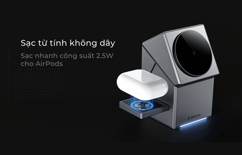 Sạc 3 thiết bị cùng lúc Căn chỉnh từ tính mạnh mẽ Tính năng sạc siêu nhanh Qi2 Tự động xoay để định vị điện thoại khi sạc Ngăn ẩn cho đế sạc Airpods & Watch Thiết kế sang trọng và thời trang