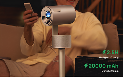 Thiết kế sáng tạo kết hợp giữa chân đế và pin sạc, giúp thoải mái điều chỉnh máy chiếu mà không lo ngại về dung lượng pin. Thưởng thức giải trí màn hình lớn bất cứ lúc nào, dễ dàng và tiện lợi.