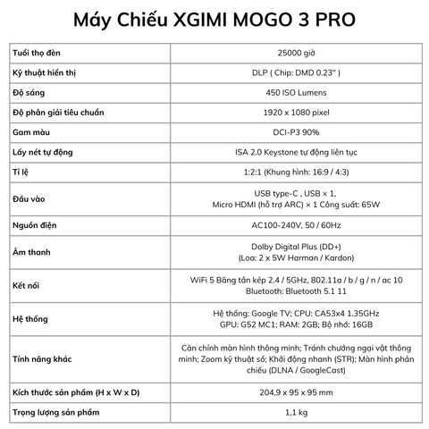 MoGo 3 Pro có độ phân giải Full HD 1080P, độ sáng 450 ISO Lumens và dải màu rộng 90% DCI-P3, mang lại hình ảnh sắc nét và rực rỡ trên màn hình lên đến 120 inch.Có hỗ trợ kết nối HDMI không?